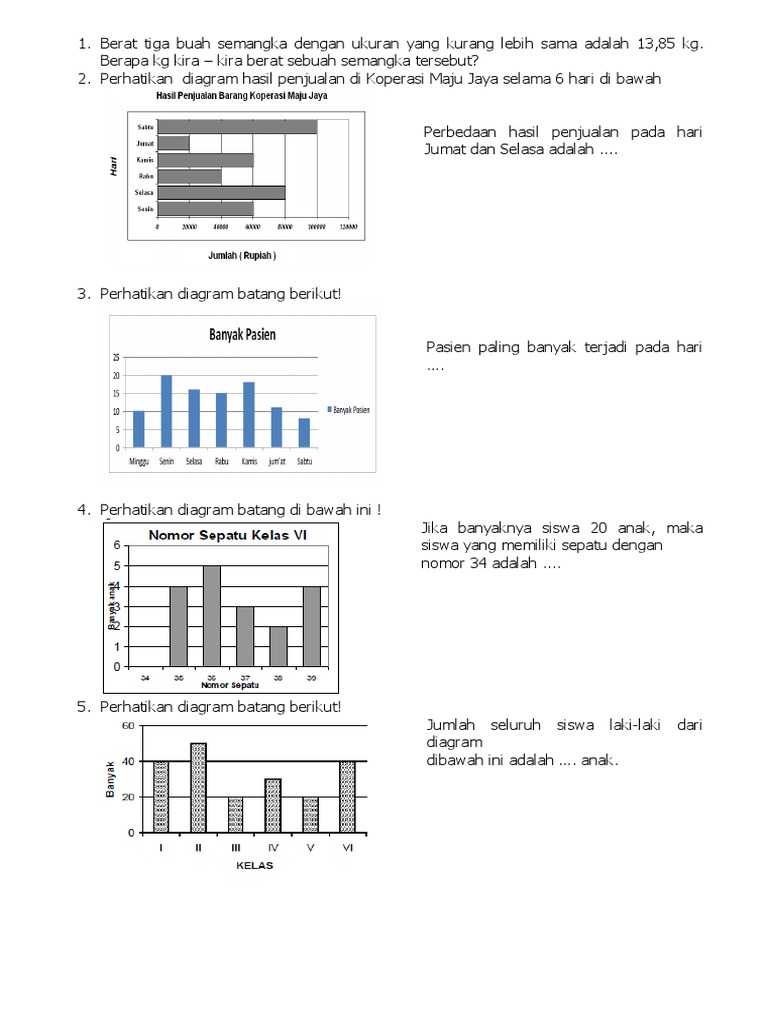 Diagram ini, umumnya digunakan untuk menggambarkan kinerja objek pencarian selama 2. Perhatikan gambar diagram batang berikut! Dalam rapat osis, sanusi menyarankan agar siswa datang ke sekolah tepat vvaktu. Gambar berikut ini menyajikan diagram batang daun untuk data yang tersedia. Tujuan dari penyajian data adalah untuk memudahkan pembacaan data. Selanjutnya perhatikan tabel nilai yang menyajikan data nilai terendah dan tertinggi, berikut dibawah ini contoh diagram batang nilai. 16 14 12 isswa 10 8 bk anya 6 4 2 0 25 27 30 32 34 beratbadan(kg) diagram batang di atas menunjukkan data tentang berat badan siswa kelas iv sdg gemilang. Diagram lingkaran untuk menggambar diagram lingkaran. Jumlah penjulan terbanyak terjadi pada tahun. Selain itu, diagram batang juga sering digunakan untuk mewakili data tunggal atau kelompok dan berguna dalam menentukan tingkat fluktuasi data. Satu sumbu pada diagram menunjukkan kategori (dimensi) yang dibandingkan. Terjawab • terverifikasi oleh ahli. Berapa siswa yang mendapat nilai 60?