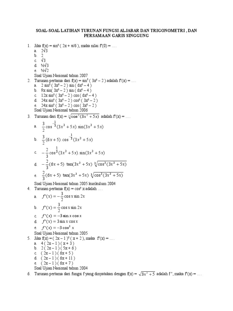 Postingan ini membahas contoh soal turunan perkalian dan turunan pembagian yang disertai penyelesaiannya atau pembahasannya. Soal turunan fungsi un 2008. Pembahasan soal un turunan fungsi smatika soal pilihan ganda turunan fungsi aljabar doc, pembahasan soal ujian nasional un bidang studi matematika ipa jenjang pendidikan sma untuk. Persamaan garis singgung kurva b. Berikut ini merupakan soal dan pembahasan mengenai turunan fungsi trigonometri yang dikumpulkan dari berbagai referensi.